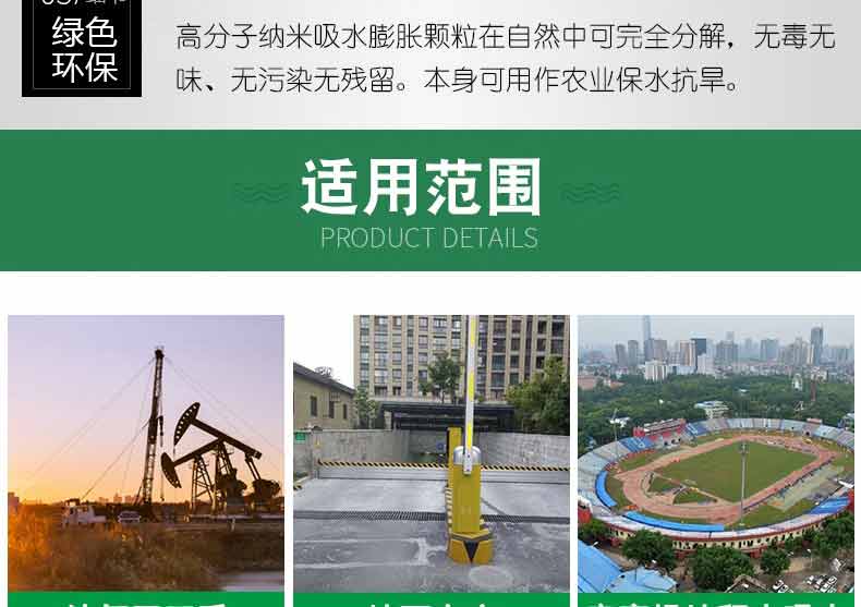 吸水膨脹袋廣泛用于防洪搶險(xiǎn),堤壩管涌,河堤堵漏,堤防漏洞、漫溢搶護(hù),防洪堤防的臨時(shí)性加高,臨時(shí)性防水圍城的構(gòu)筑,水庫,江河大堤滲水滑坡,護(hù)坡防沖,工程截流,暗溝和暗洞的堵塞。用于庫房,庭院,溝塘,被淹耕地排水;用于容易淹水的工廠,隧道,地下停車場,地鐵等領(lǐng)域作為防水的使用;用于市政設(shè)施、道路施工,工地橋梁建設(shè),競賽場地等積水處吸水去水。是我國各地水利,水務(wù),防汛辦,防汛物資儲備及市政排水,和城市易澇區(qū)必備的應(yīng)急防汛儲備物資。