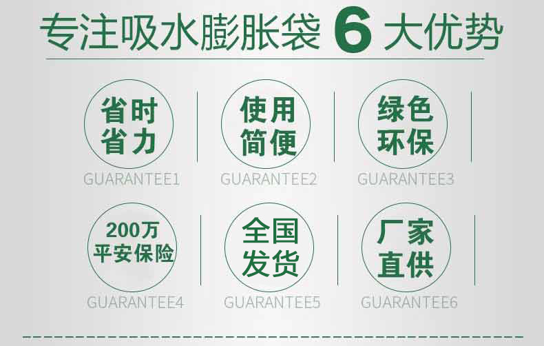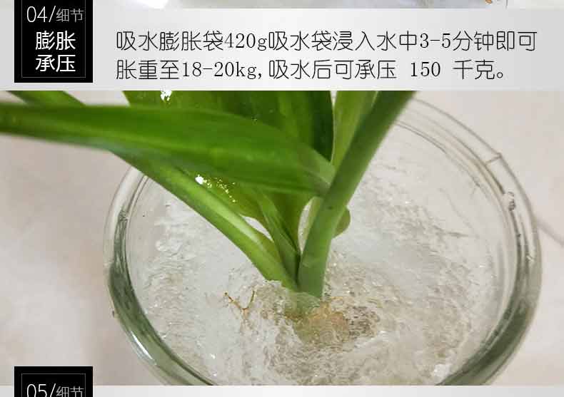 吸水膨脹袋內(nèi)裝的是新型的高分子納米吸水物質(zhì),這種物質(zhì)無毒、無味、無污染,吸水膨脹前為極小的顆粒物質(zhì),吸水后為黑豆大小的含水物質(zhì),干凈且無公害,待高分子吸水物質(zhì)使用后可用于農(nóng)業(yè)保水抗旱,所以在洪水過后可就地將袋內(nèi)的物質(zhì)傾倒入農(nóng)田中,在泥土中可完全分解,是綠色環(huán)保、一舉兩得的首選產(chǎn)品。外袋為純麻布和棉布織成,遇水后麻繩可更加結(jié)實(shí)耐磨。