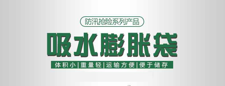 膨脹防洪袋,使用前體積小,重量輕,存放,運(yùn)輸方便。與傳統(tǒng)的沙袋相比,在搶險(xiǎn)防洪時(shí)大大減小時(shí)間和人力,另防洪搶險(xiǎn)更有效率。吸水膨脹袋屬環(huán)保產(chǎn)品,無毒,無害,無味,無污染。可自然降解。