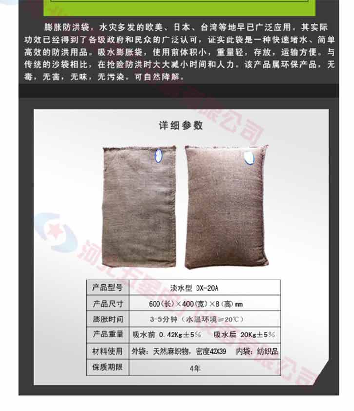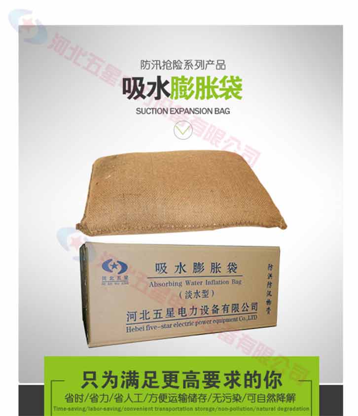 膨脹防洪袋,使用前體積小,重量輕,存放,運(yùn)輸方便。與傳統(tǒng)的沙袋相比,在搶險(xiǎn)防洪時(shí)大大減小時(shí)間和人力,另防洪搶險(xiǎn)更有效率。吸水膨脹袋屬環(huán)保產(chǎn)品,無毒,無害,無味,無污染。可自然降解。