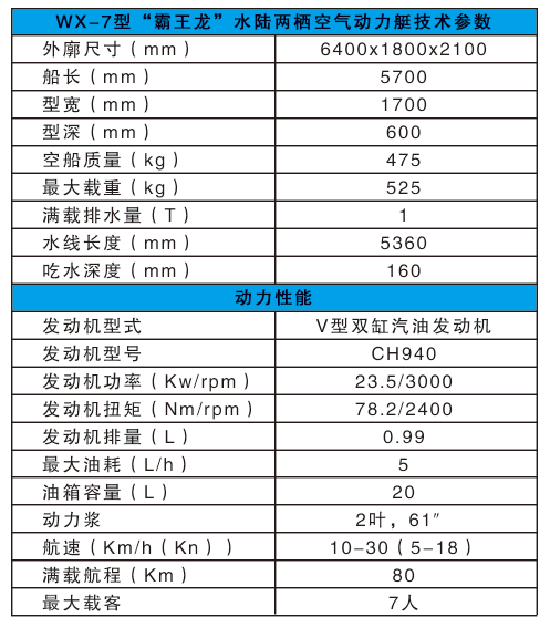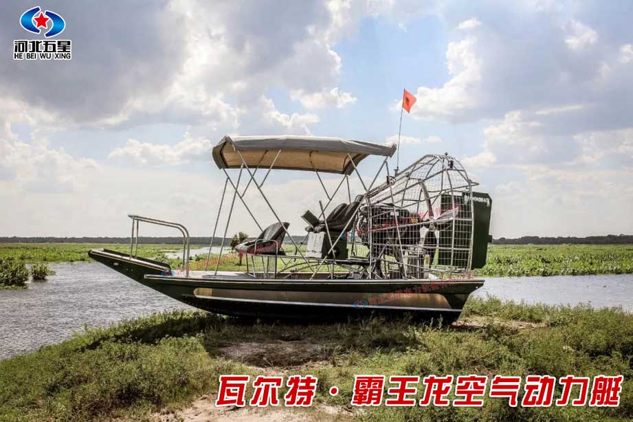 河北五星“霸王龍”水陸兩棲空氣動力艇是一種運(yùn)用空氣動力學(xué)、采用航空發(fā)動機(jī)和空氣螺旋槳推動,通過置于船體上部的大功率內(nèi)燃機(jī)帶動碳纖維螺旋槳產(chǎn)生空氣動力的多地形交通工具。所搭載的航空發(fā)動機(jī)動力系統(tǒng)強(qiáng)勁,功率可達(dá)300馬力以上,螺旋槳推力可達(dá)500公斤以上,操縱機(jī)動靈活,靜水巡航速度可達(dá)40km/h,可以高時速可達(dá)70km--120km/h。