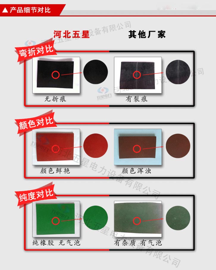 絕緣膠墊產(chǎn)品顏色為黑色、紅色、綠色。 不含雜質(zhì):原生橡膠材質(zhì),不含次生膠,切面不會(huì)有粉末 柔韌性好:具有優(yōu)良的絕緣性能,彈性強(qiáng),拉伸強(qiáng)度大 光澤度高:原生橡膠材質(zhì),無(wú)任何塑料成分,表面光澤度高 無(wú)氣泡:五星電力絕緣膠墊,表面無(wú)氣泡,無(wú)裂痕