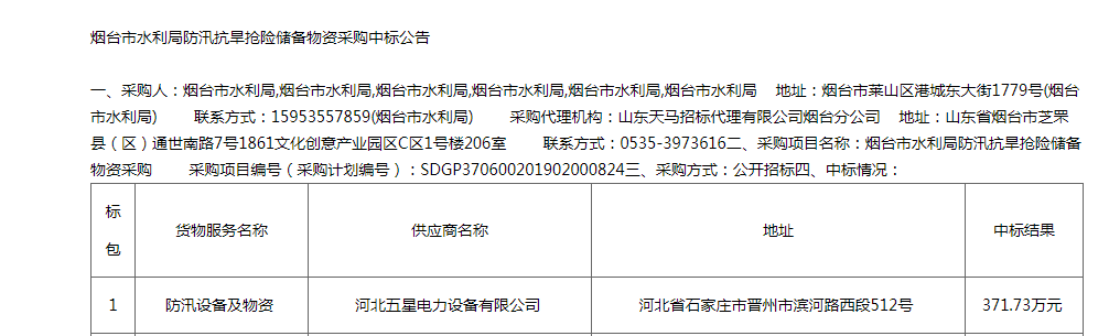 熱烈祝賀河北五星煙臺(tái)市水利局防汛抗旱搶險(xiǎn)儲(chǔ)備物資采購一舉中標(biāo)!